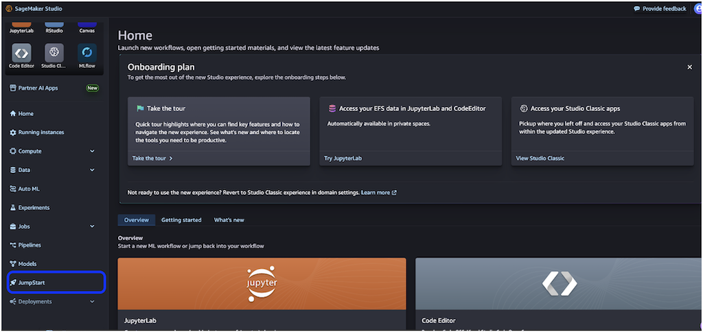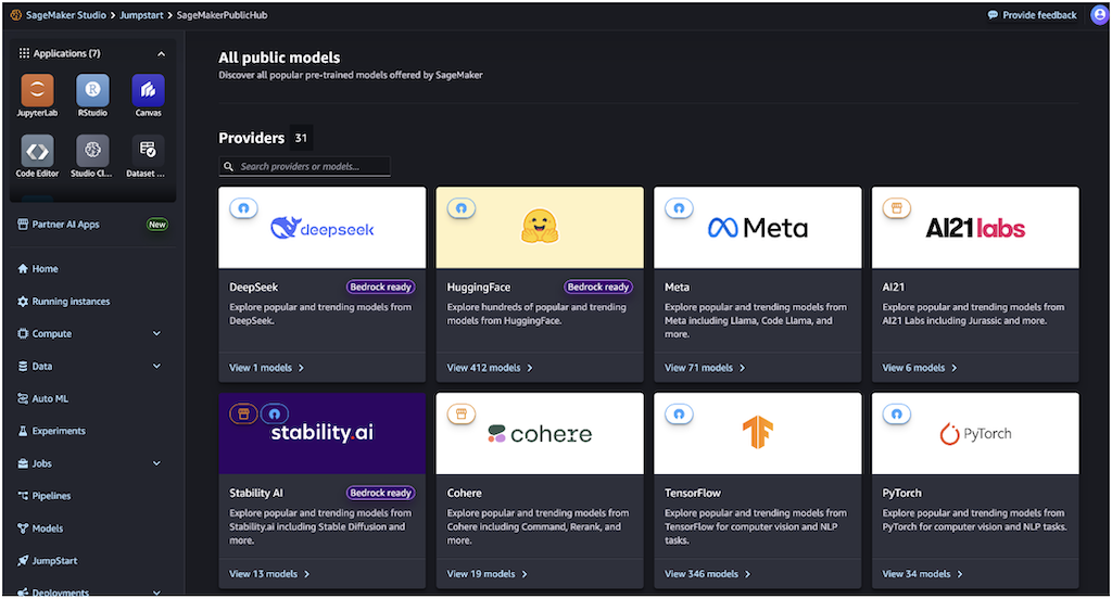 - On the SageMaker Studio console, choose JumpStart in the navigation pane.