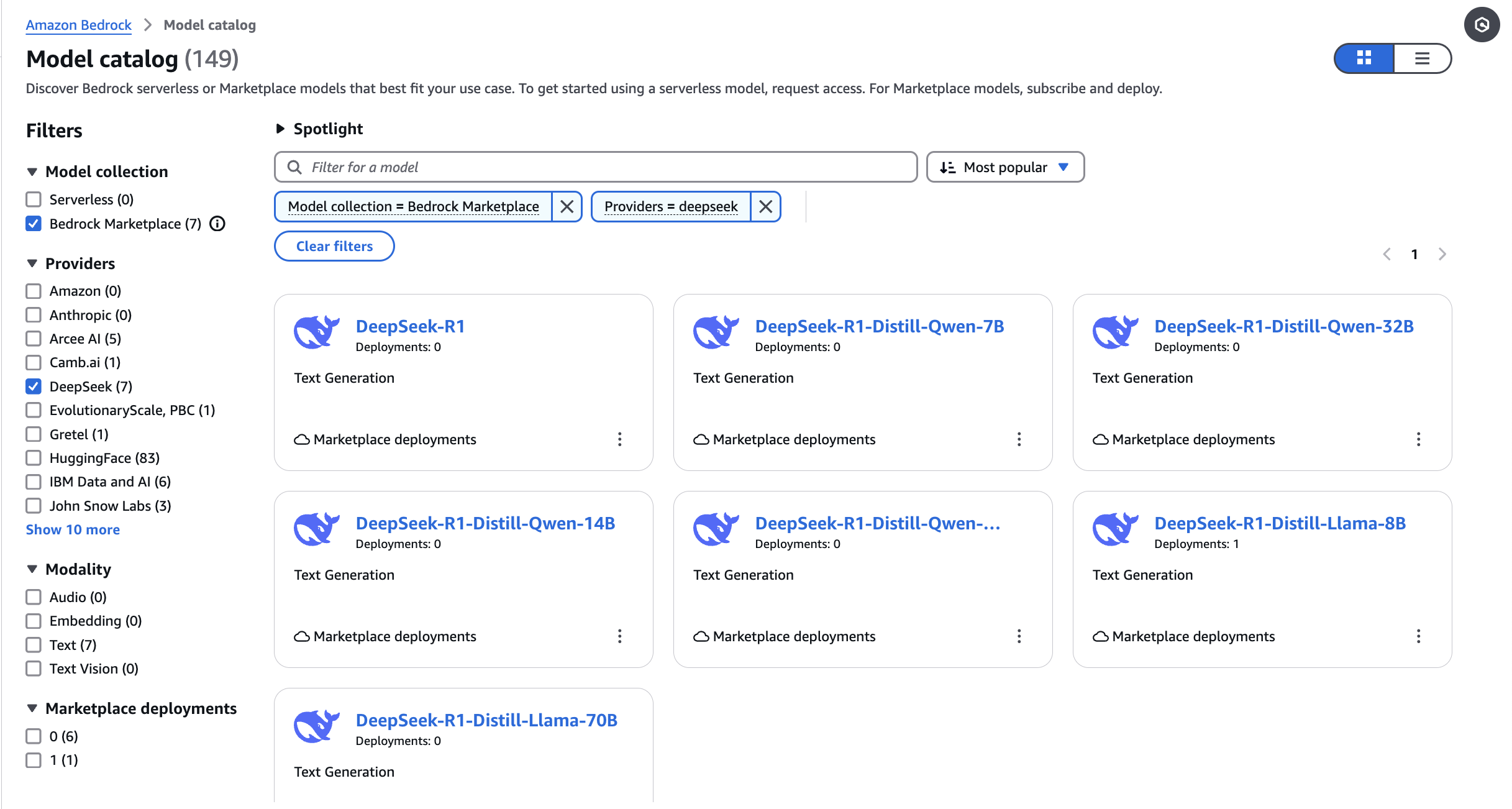 At the time of writing this post, you can use theInvokeModelAPI to invoke the model. It doesn’t support Converse APIs and other Amazon Bedrock tooling. - Filter for DeepSeek as a provider and choose the DeepSeek-R1 model.