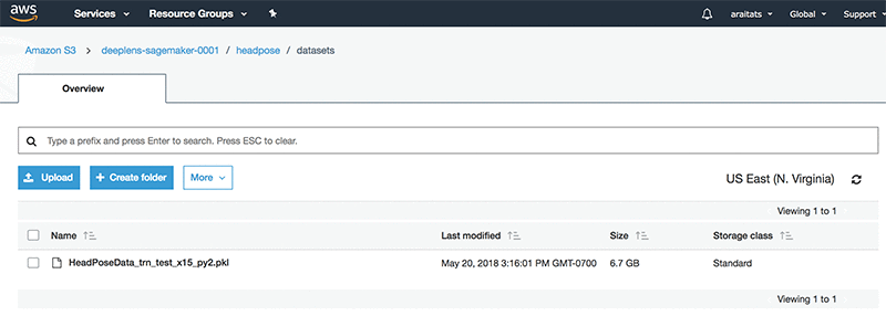 Just like we did in our last blog post, we are first going to create an Amazon S3 bucket using the Amazon S3 console. In this example, we are going to name the S3 bucket “deeplens-sagemaker-0001” hosted in the N. Virginia (US East 1) AWS Region. (If you want to deploy your trained model artifacts straight into AWS DeepLens, the Region must be N. Virginia (US East 1)).