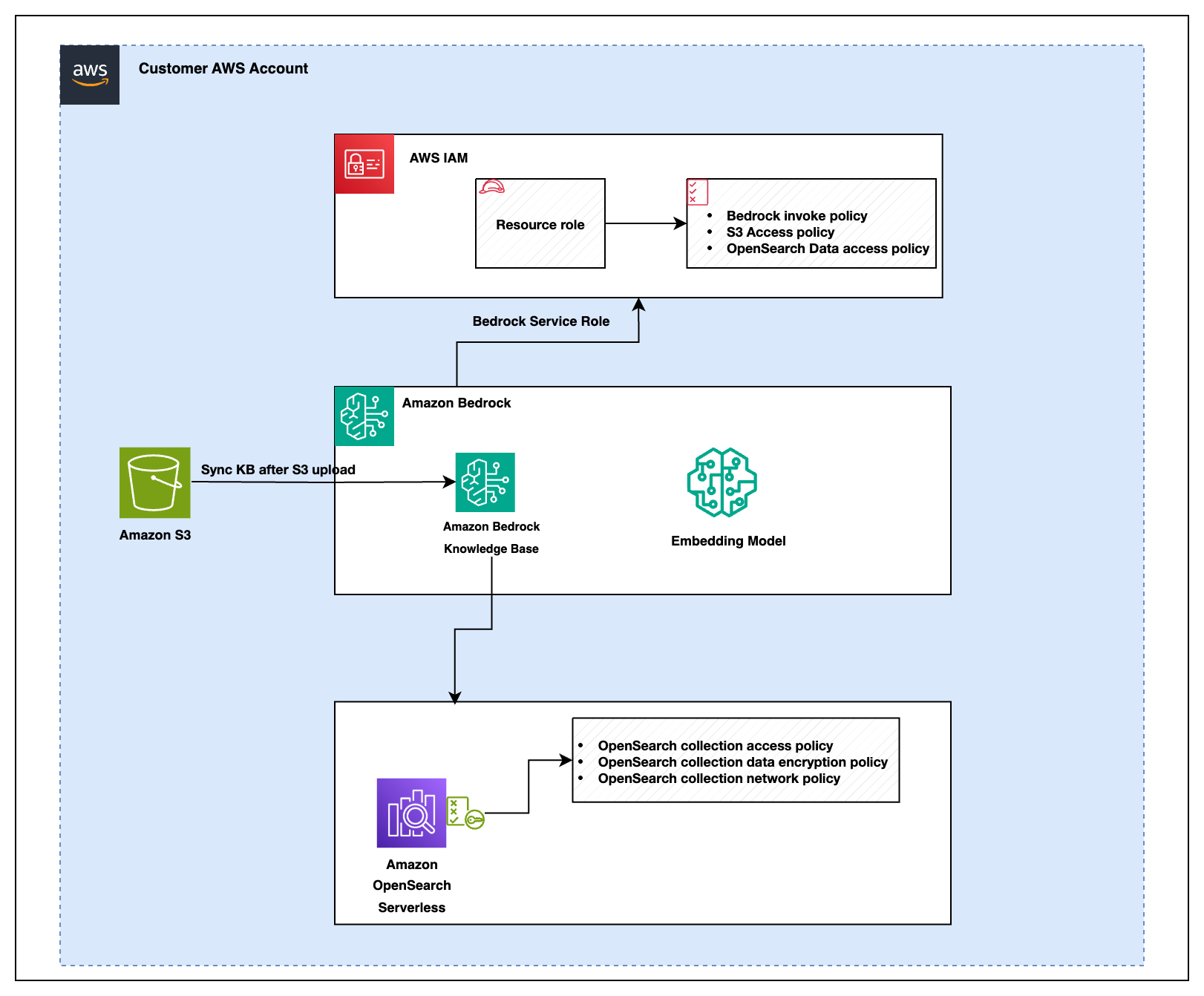 - Amazon S3 access policy: Grants necessary read and write permissions to the system components ( like Amazon Bedrock, AWS OpenSearch, or other services) that require access to Amazon Simple Storage Service (Amazon S3) for secure data storage and retrieval.