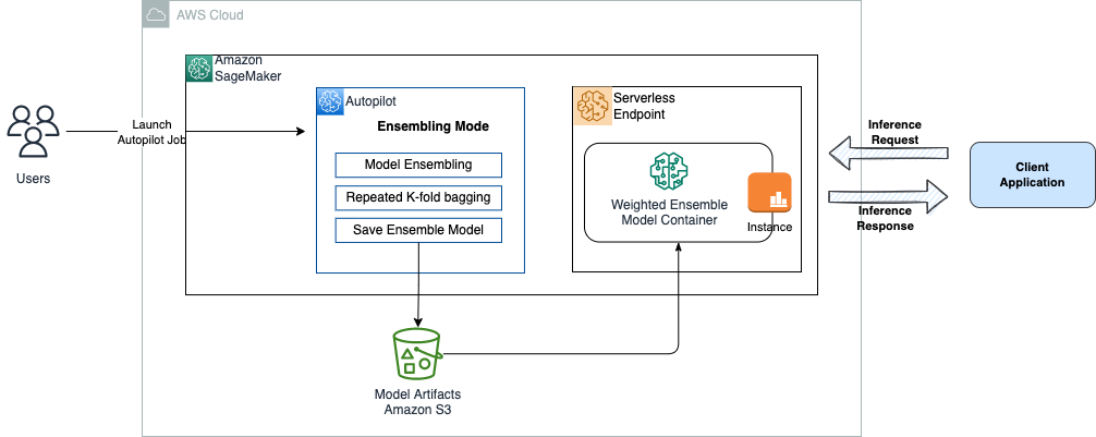 We launch two Autopilot jobs using the Boto3 libraries for SageMaker. The first job uses ensembling as the chosen training mode. We then deploy the single ensemble model generated to a serverless endpoint and send inference requests to this hosted endpoint.