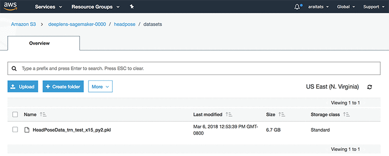 Create an AmazonS3 bucket first if you don’t have one. In this example, we are going to name the S3 bucket “deeplens-sagemaker-0000” hosted in the N. Virginia (US East 1) AWS Region. (If you want to deploy your trained model artifacts straight into AWS DeepLens, the region must be N. Virginia (US East 1)).