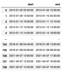 Now we use the updated training dataset with the simulated inference data we created earlier, in which the human reviewers indicated that they found faulty equipment when running the inference. Run the following code to modify the index of the simulated inference dataset to reflect a 10-minute duration for each reading: