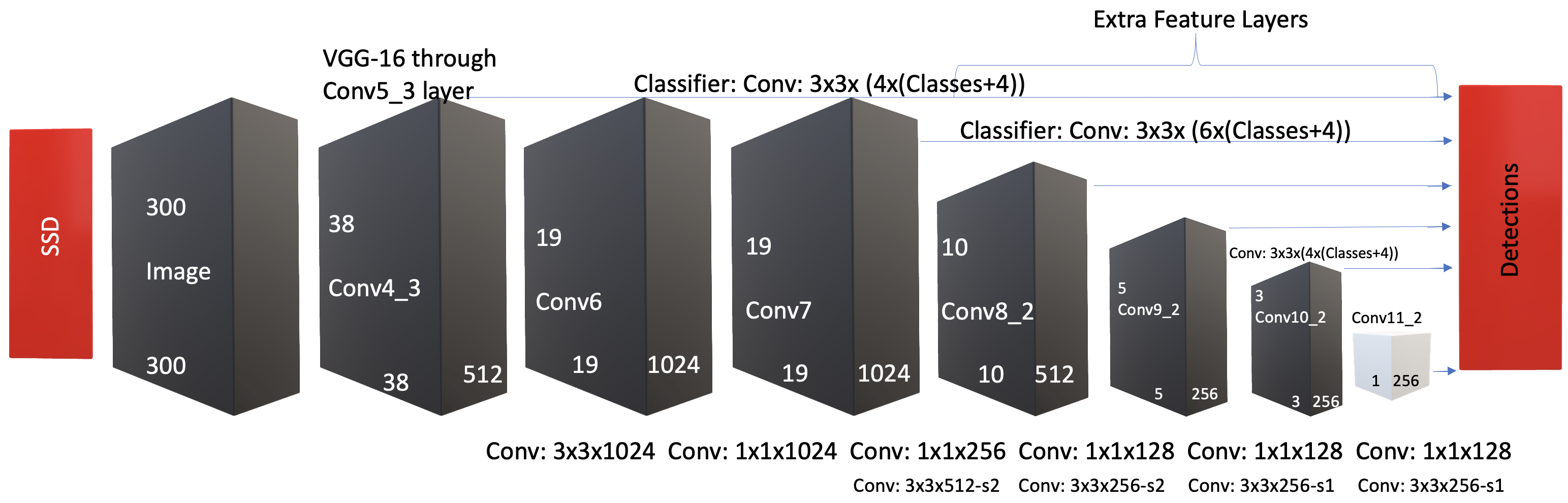 The second model of the localization pipeline, the supervised approach, uses the SSD algorithm with a MobileNet backbone in place of VGG-16 pretrained on the Common Objects in Context (COCO) dataset. We followed a similar pipeline structure as the unsupervised VAE method for testing. We randomly selected images from our data and fed them into the network. The network output the coordinates for bounding box predictions of the defects. Then, we uploaded all of the images to the original S3 bucket with all the detected defects surrounded by bounding boxes. The original SSD architecture is depicted in the following figure.