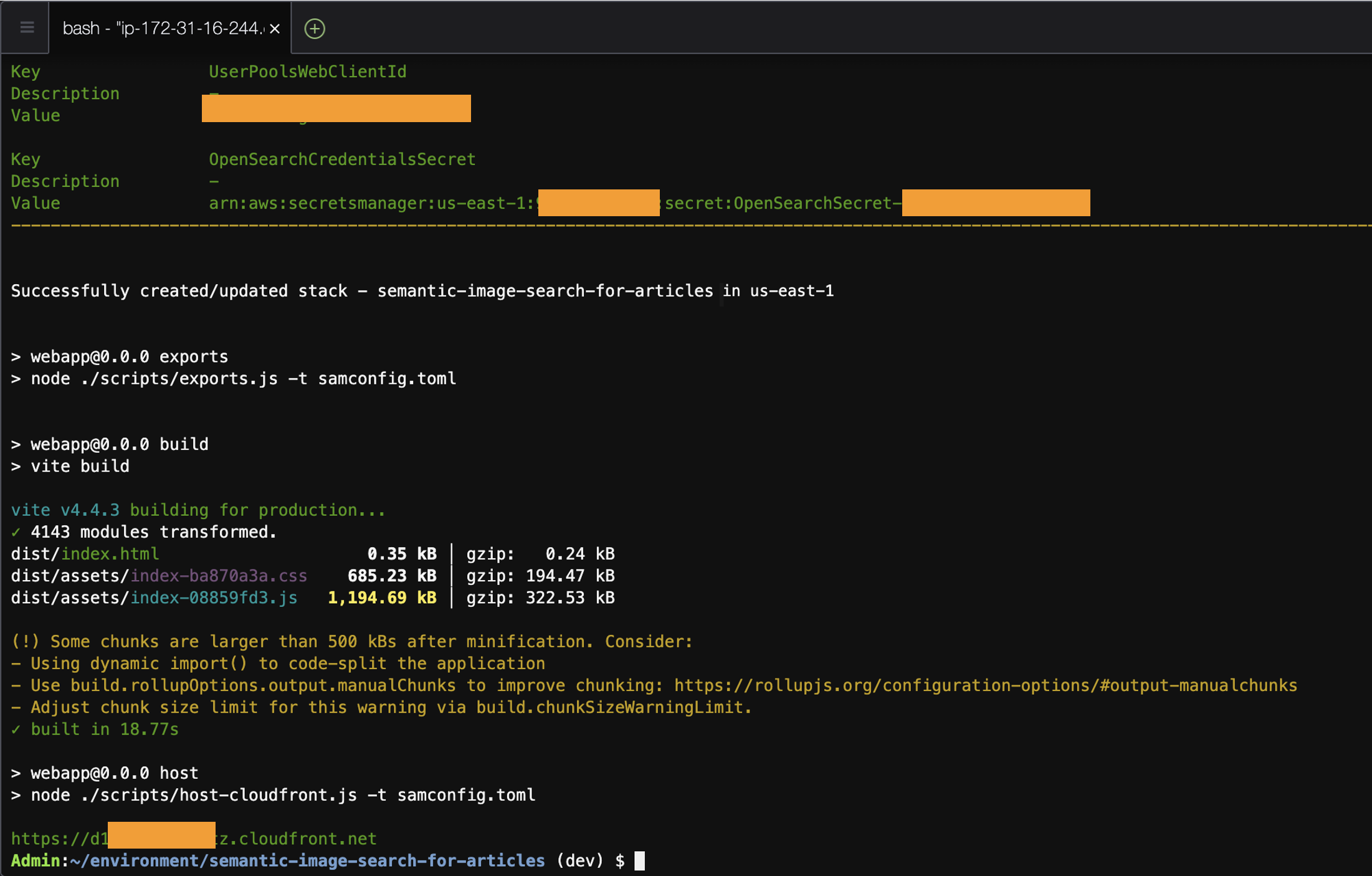 The following screenshot shows how the script has used AWS SAM to deploy your stack and has output an Amazon CloudFront URL you can use to access the application.