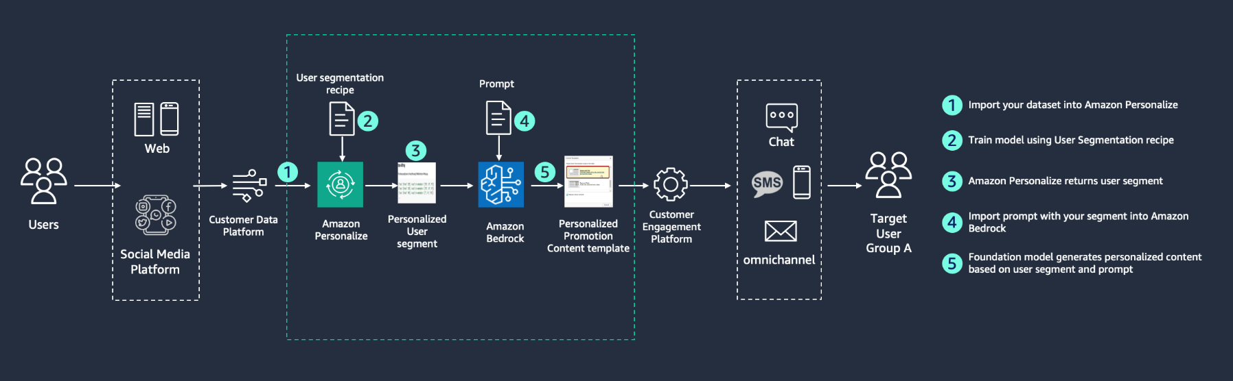Generative artificial intelligence is transforming how enterprises do business. Organizations are using AI to improve data-driven decisions, enhance omnichannel experiences, and drive next-generation product development. Enterprises are using generative AI specifically to power their marketing efforts through emails, push notifications, and other outbound communication channels. Gartner predicts that “by 2025, 30% of outbound marketing messages from large organizations will be synthetically generated.” However, generative AI alone isn’t enough to deliver engaging customer communication. Research shows that the most impactful communication is personalized—showing the right message to the right user at the right time. According to McKinsey, “71% of consumers expect companies to deliver personalized interactions.” Customers can use Amazon Personalize and generative AI to curate concise, personalized content for marketing campaigns, increase ad engagement, and enhance conversational chatbots.