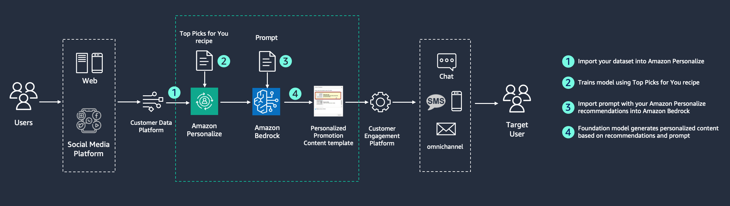 With Amazon Personalize and Amazon Bedrock, you can generate personalized recommendations and create outbound messages with a personal touch tailored to each of your users.