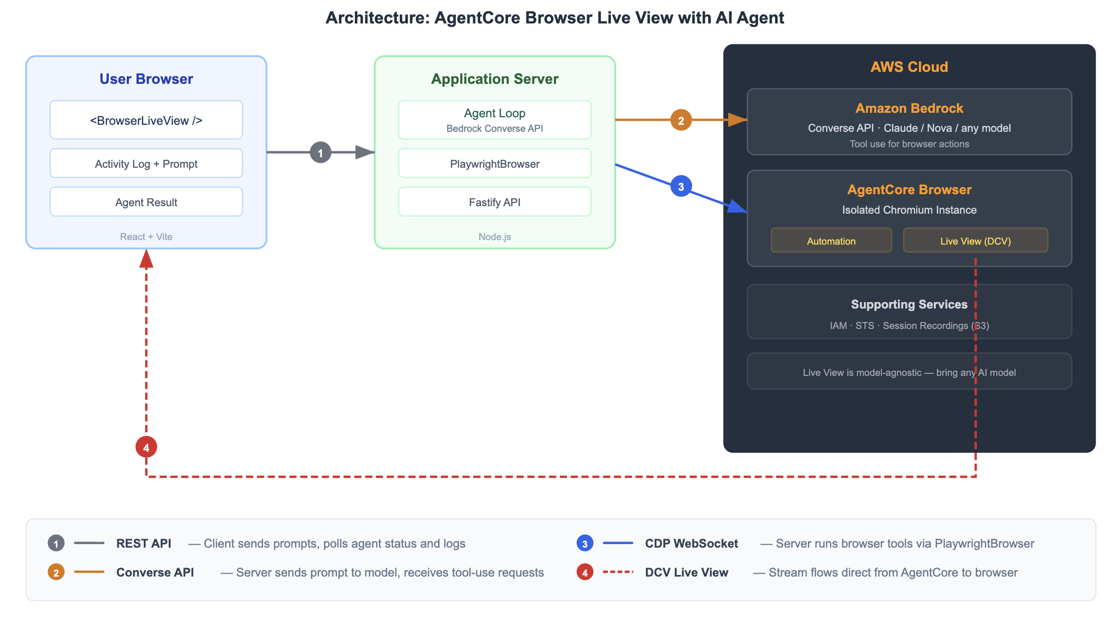 Arrow 4 (red, dashed): The DCV Live View stream flows directly from Amazon Bedrock AgentCore to the User Browser, bypassing the Application Server.