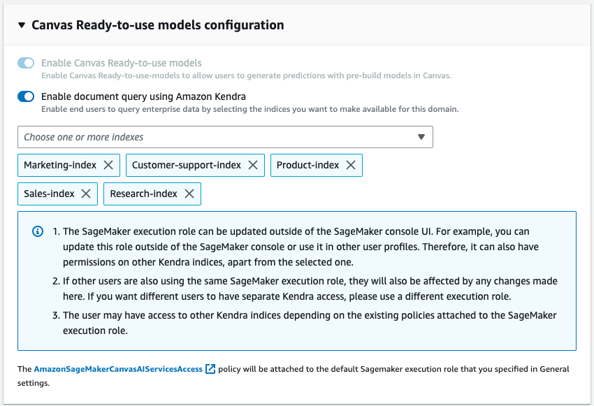 Connecting SageMaker Canvas to Amazon Kendra requires a one-time set-up. We describe the set-up process in detail in Setting up Canvas to query documents. If you haven’t already set-up your SageMaker Domain, refer to Onboard to Amazon SageMaker Domain.