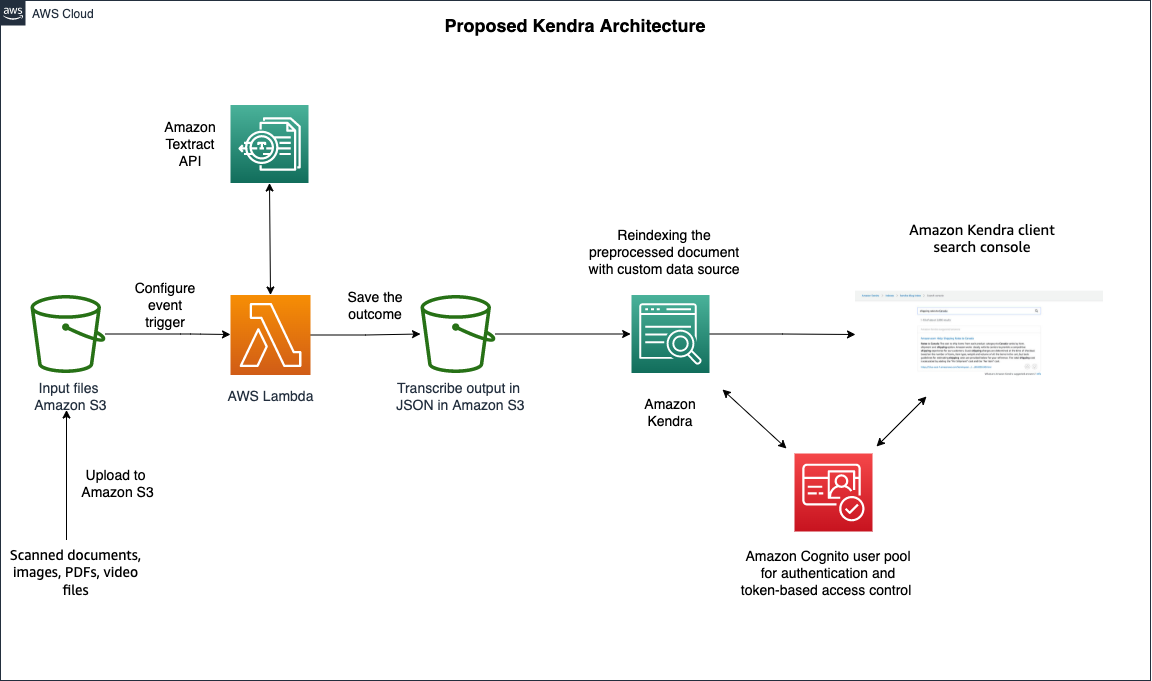 Amazon Kendra supports a variety of document formats, such as Microsoft Word, PDF, and text. While working with a leading Edtech customer, we were asked to build an enterprise search solution that also utilizes images and PPT files. This post focuses on extending the document support in Amazon Kendra so you can preprocess text images and scanned documents (JPEG, PNG, or PDF format)  to make them searchable. The solution combines Amazon Textract for document preprocessing and optical character recognition (OCR), and Amazon Kendra for intelligent search.