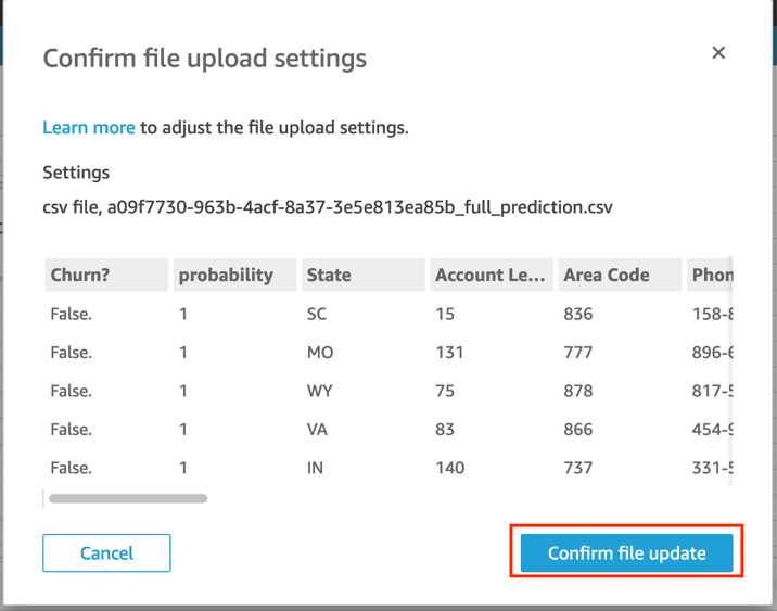 - Repeat the steps from the Use the customer churn model section of this post to get predictions for the new dataset, and download the new file.