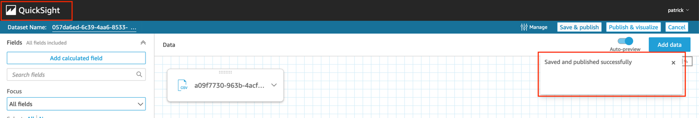 - When the “Saved and published successfully” message apears, you can go back to the main menu by choosing the QuickSight logo in the left upper corner.