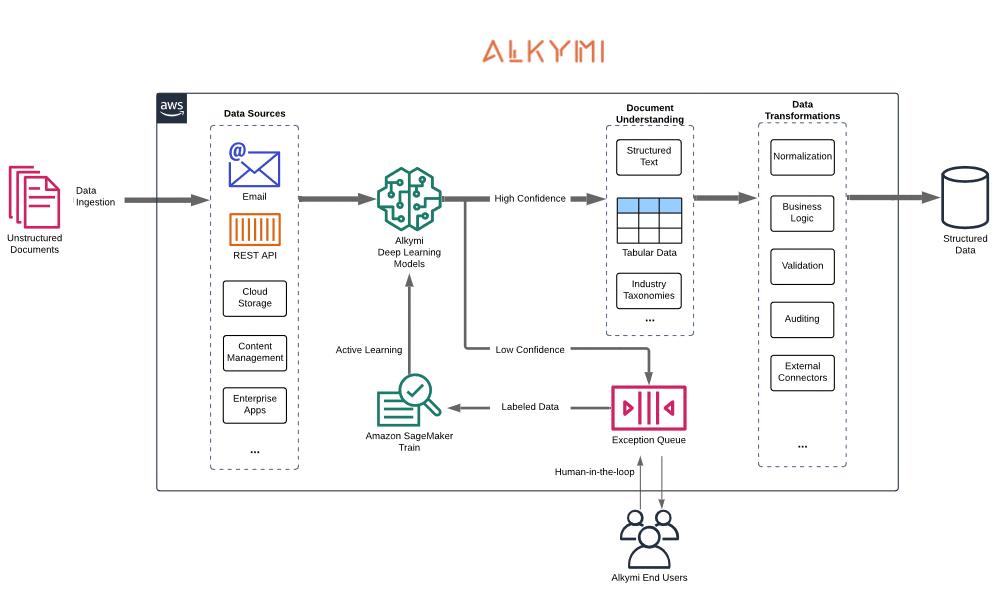 Alkymi uses AWS as their primary AI/ML platform. The CEO of Alkymi, Harald Collet, notes, “We apply AI to help automate tasks on documents that require human comprehension, and AWS has enabled us to quickly launch new functionality with the security and scalability that financial services customers require.” As Alkymi ingests documents, emails, and images, the platform automates data extraction and data entry tasks by using various AWS services. “AWS allows us to scale our platform to handle customers of all sizes. Amazon SageMaker has improved our development process by providing our data scientists with a way to train and deploy models to production,” remarks Alkymi CTO Steven She.