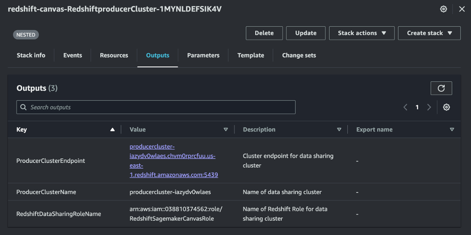 ProducerClusterNamefrom the CloudFormation nested stack outputs. - You can reference the preceding screen shot for Nested Stack, where you will find the cluster identifier output.