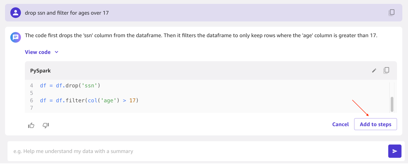 Drop ssn and filter for ages over 17and click on the run arrow. You will see it was able to handle both steps. You can also view the PySpark code that it ran. To add these steps as dataset transforms, choose Add to steps.