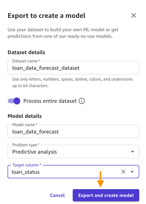 loan_data_forecast_datasetfor the Dateset name, for Model name, enterloan_data_forecast, for Problem type, selectPredictive analysis, for Target column, selectloan_status, and click Export and create model.