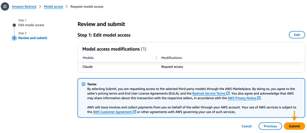 - Open the AWS Management Console, go to Amazon Bedrock, and choose Model access in the navigation pane.
