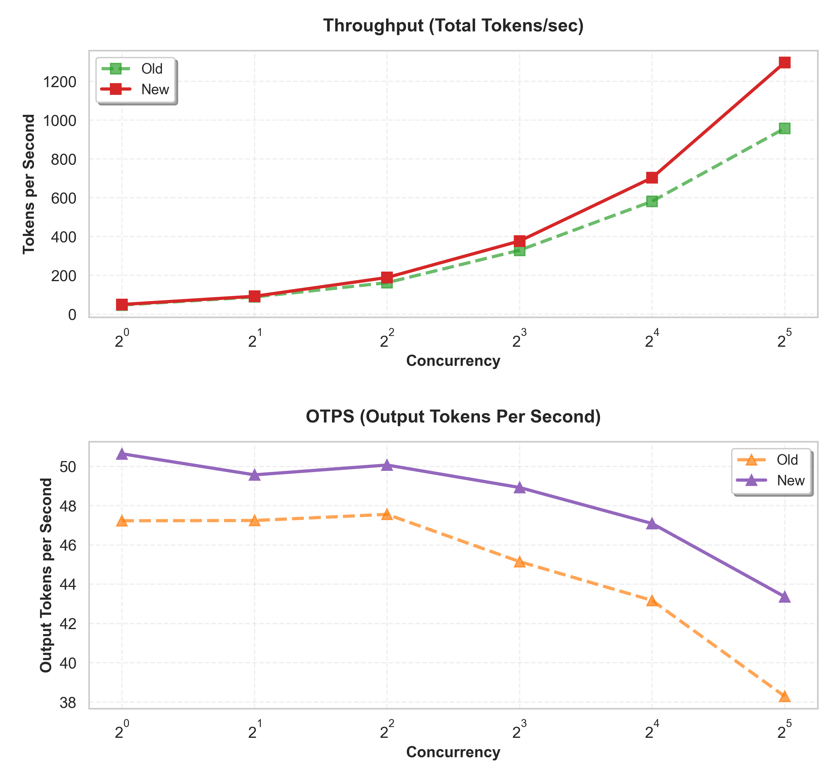 - Output Tokens Per Second (OTPS): Increased from 44.8 to 48.3 tokens/sec (7.8% increase). Faster token generation improves streaming response quality.