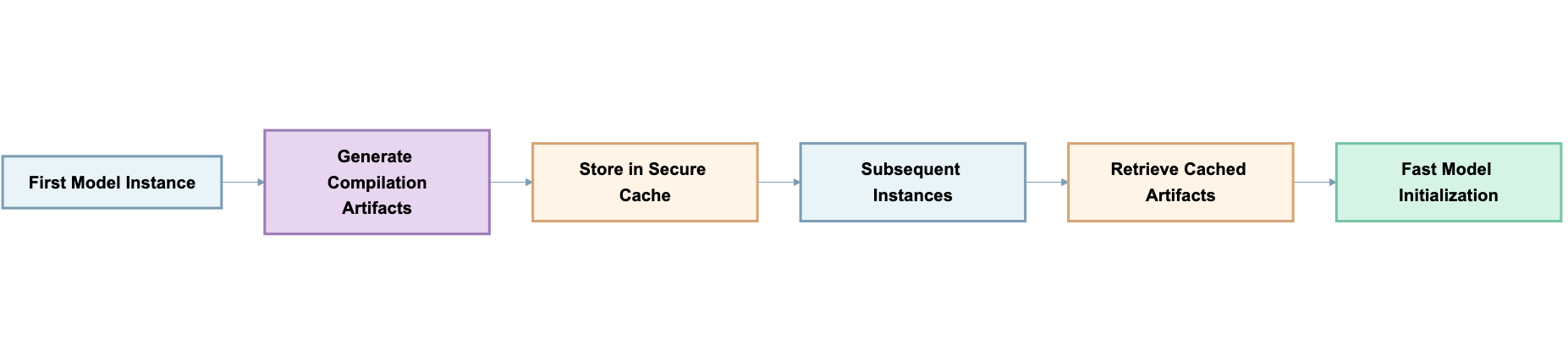 With a compilation caching architecture, performance improves because the system no longer repeats computational work at startup. When the first instance of a model starts, the inference engine performs several computationally intensive operations: