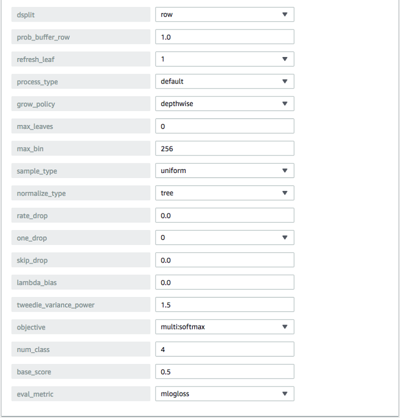 Under Hyperparameters set early_stopping_rounds to 5, num_rounds to 10, change the objective to multi:softmax, num_class to 4, and eval_metric to mlogloss. This will configure XGBoost to run a classification model that works with the data was pre-processed in AWS Glue.
