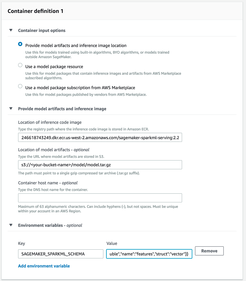 For Container definition 1, under Container input options, choose Provide model artifacts and inference image location. Under Location of inference image enter 246618743249.dkr.ecr.us-west-2.amazonaws.com/sagemaker-sparkml-serving:2.2. This is the SparkML serving image provided by Amazon SageMaker. The full list of SparkML images provided for every region is available here. Under Location of model artifacts, enter s3://<your-bucket-name>/model/model.tar.gz. These are the pre-processor artifacts created when running the AWS Glue job we ran earlier.