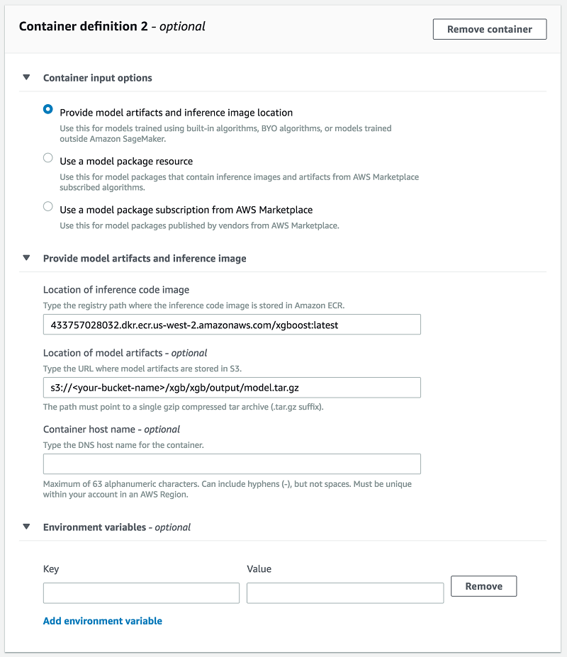 For Container definition 2, under Container input options, select Provide model artifacts and inference image location.