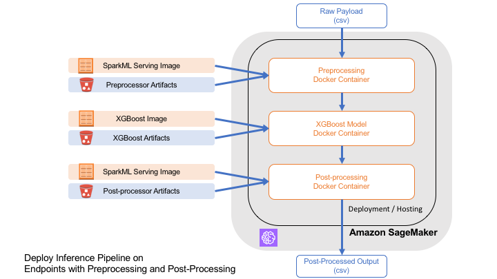 After a few minutes, Amazon SageMaker creates an endpoint using all three of the provided containers on a single instance. When the endpoint is invoked with a payload, the output of the earlier containers is passed as the input to the later containers, until the payload reaches its final output.