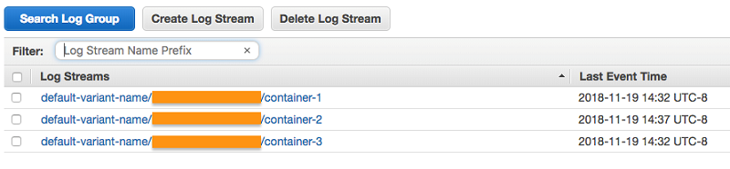 Locate the Monitor section, and you will find a View logs link. Select it, and you will be taken to a CloudWatch Logs interface. For our example endpoint, there are three sets of log streams, one for each container. It should look like this: