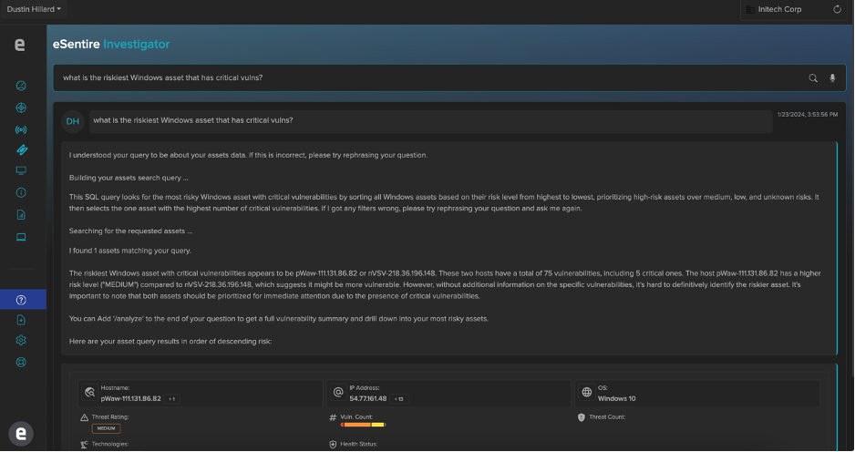 The following screenshot shows an example of eSentire’s AI Investigator output. As illustrated, a natural language query is posed to the application. The tool is able to correlate multiple datasets and present a response.
