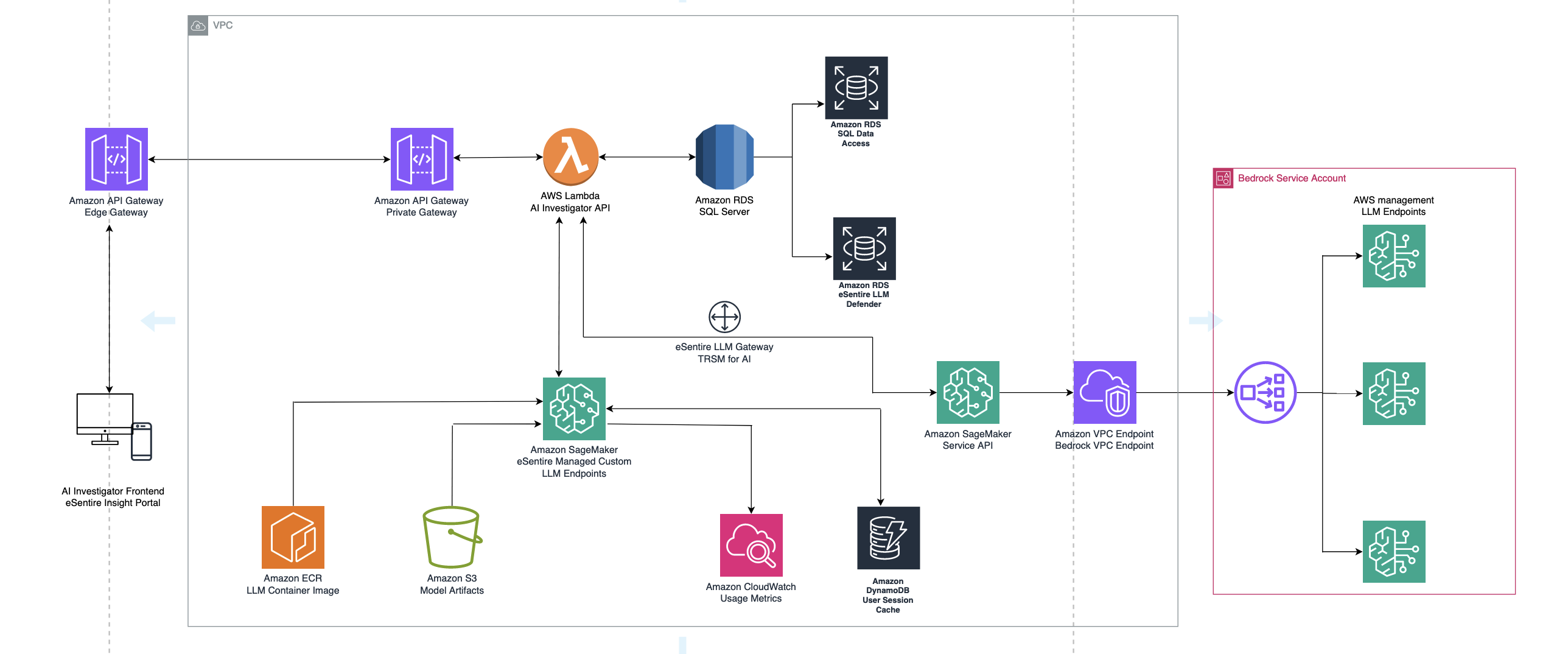 - SageMaker real-time inference endpoints provide the infrastructure needed for hosting their custom self-trained LLMs. This was very useful in combination with SageMaker integration with Amazon Elastic Container Registry (Amazon ECR), SageMaker endpoint configuration, and SageMaker models to provide the entire configuration required to spin up their LLMs as needed. The fully featured end-to-end deployment capability provided by SageMaker allowed eSentire to effortlessly and consistently update their model registry as they iterate and update their LLMs. All of this was entirely automated with the software development lifecycle (SDLC) using Terraform and GitHub, which is only possible through SageMaker ecosystem.