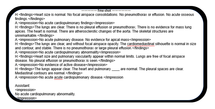 In this work, five examples of findings and impressions were provided to the model for few-shot learning as shown in Figure 2.