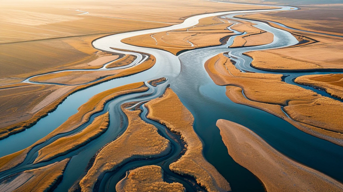 Overhead perspective of winding river delta, capturing intricate branching waterways and sediment patterns. Soft morning light revealing subtle color gradations between water and land. Revealing landscape’s hidden fluid dynamics from bird’s-eye view. Sparse arctic tundra landscape at twilight, expansive white terrain with isolated rock formations silhouetted against a deep blue sky. Low-contrast black and white composition capturing the infinite horizon, with subtle purple hues in the shadows. Ultra-wide-angle perspective emphasizing the vastness of negative space and geological simplicity.