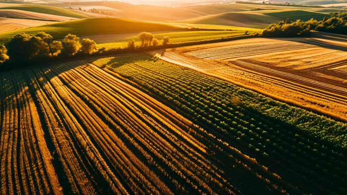 Wide-angle aerial shot of patchwork agricultural terrain at golden hour, with long shadows accentuating the texture and topography of the land. Emphasis on the interplay of light and shadow across the geometric field divisions. Dynamic drone perspective of a dramatic shoreline at golden hour, capturing long shadows cast by towering sea stacks and coastal cliffs. Hyper-detailed imagery showcasing the interplay of warm sunlight on rocky textures and the cool, foamy edges of incoming tides.
