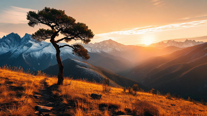 Dramatic wide-angle shot of a rugged mountain range at sunset, with a lone tree silhouetted in the foreground, creating a striking focal point. Wide-angle capture of a hidden beach cove, surrounded by towering cliffs, with a shipwreck partially visible in the shallow waters.