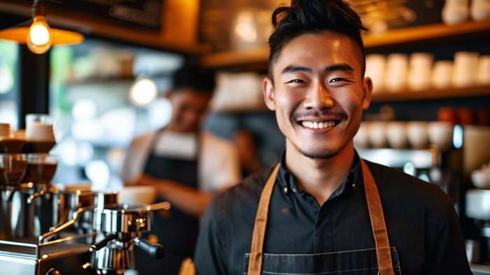 A dynamic profile shot of a barista in motion, captured mid-conversation with a customer. Their smile is genuine and inviting, with laugh lines accentuating their seasoned experience. The cafe’s interior is rendered in soft bokeh, maintaining the cinematic feel with a shallow depth of field. A front-facing portrait of an experienced barista, their welcoming smile framed by the sleek espresso machine. The background bustles with blurred cafe activity, while the focus remains sharp on the barista’s friendly demeanor. The lighting is contrasty, enhancing the cinematic mood.