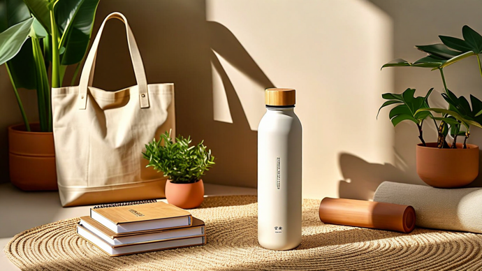 A flat lay featuring a premium matte metal water bottle with bamboo accents, placed on a textured linen cloth. Eco-friendly items like a cork notebook, a sprig of eucalyptus, and a reusable straw are arranged around it. Soft, natural lighting casts gentle shadows, emphasizing the bottle’s matte finish and bamboo details. The background is an earthy tone like beige or light gray, creating a harmonious and sustainable composition. Angled perspective of the premium water bottle with bamboo elements, positioned on a natural jute rug. Surrounding it are earth-friendly items: a canvas tote bag, a stack of recycled paper notebooks, and a terracotta planter with air-purifying plants. Warm, golden hour lighting casts long shadows, emphasizing textures and creating a cozy, sustainable atmosphere. The scene evokes a sense of eco-conscious home or office living.