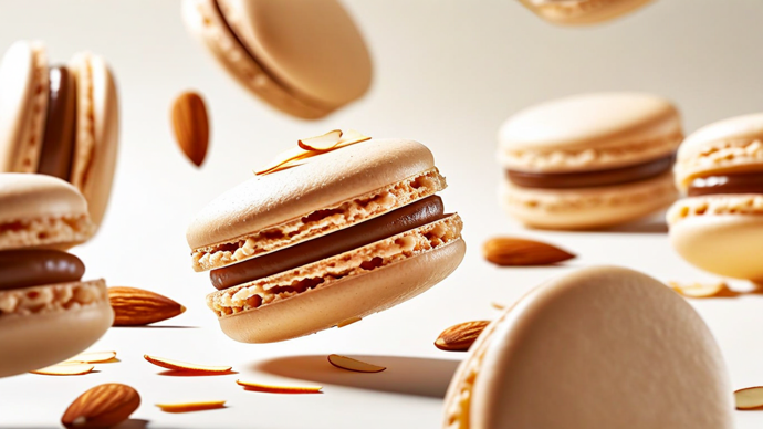 A pyramid of macarons in ombre pastels, arranged on a matte black slate surface. Dramatic side lighting from left. Close-up view highlighting texture of macaron shells. Garnished with edible gold leaf accents. Shot at f/2 aperture for shallow depth of field. Disassembled macaron parts in zero-g chamber. Textured cookie halves, viscous filling streams, and scattered almond slivers drifting. High-contrast lighting with subtle shadows on off-white. Wide-angle shot showcasing full dispersal pattern.
