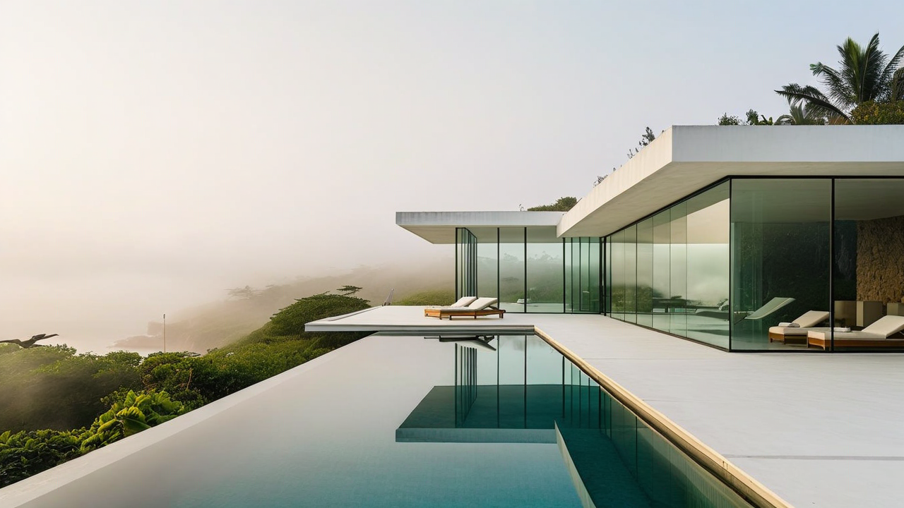 An angular white modernist house featuring expansive glass walls, photographed for Architectural Digest’s cover. Misty morning atmosphere, elongated infinity pool creating a mirror image, three-quarter aerial view, lush coastal vegetation framing the scene.
