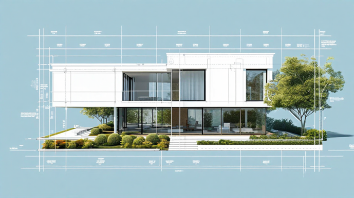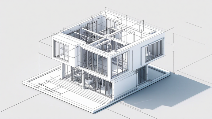 A white cubic house with floor-to-ceiling windows presented as detailed architectural blueprints. Site plan view showing landscaping and property boundaries, technical annotations, blue background with white lines, precise measurements and zoning specifications visible. A white cubic house with floor-to-ceiling windows in precise isometric projection. X-ray style rendering revealing internal framework, electrical wiring, and plumbing systems. Technical cross-hatching on load-bearing elements and foundation.