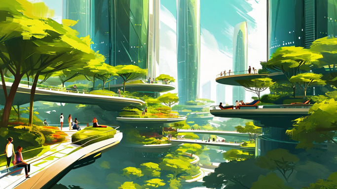 A stylized digital painting of a bustling plaza in a futuristic eco-city, with soft impressionistic brushstrokes. Crystalline towers frame the scene, while suspended gardens create a canopy overhead. Holographic displays and eco-friendly vehicles add life to the foreground. Dreamlike and atmospheric, with glowing highlights in sapphire and rose gold. A stylized digital painting of an elevated park in a futuristic eco-city, viewed from a high angle, with soft impressionistic brushstrokes. Crystalline towers peek through a canopy of trees, while winding elevated walkways connect floating garden platforms. People relax in harmony with nature. Dreamlike and atmospheric, with glowing highlights in jade and amber.