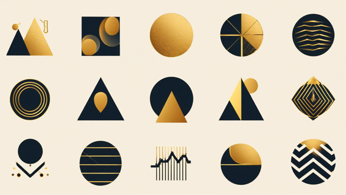 A set of minimalist icons for a health tracking app. Dual-line design with 1.5px stroke weight on solid backgrounds. Each icon uses teal for the primary line and a lighter shade for the secondary line, with ample negative space. Icons maintain consistent 64x64px dimensions with centered compositions. Clean, professional aesthetic suitable for both light and dark modes. Stylized art deco icons for fitness tracking. Geometric abstractions of health symbols with gold accents. Balanced designs incorporating circles, triangles, and zigzag motifs. Clean and sophisticated.