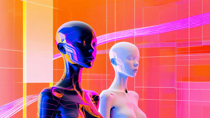 Abstract figures emerging from digital screens, gradient color transitions, mixed textures, dynamic composition, conceptual narrative style. Abstract humanoid forms materializing from multiple digital displays, vibrant color gradients flowing between screens, contrasting smooth and pixelated textures, asymmetrical layout with visual tension, surreal storytelling aesthetic.