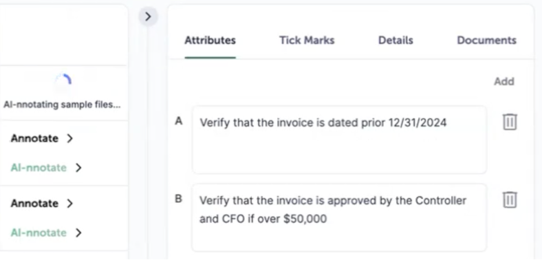 - Bulk annotation for efficiency – You can select multiple documents or testing controls for bulk annotation, reducing time spent on repetitive document processing