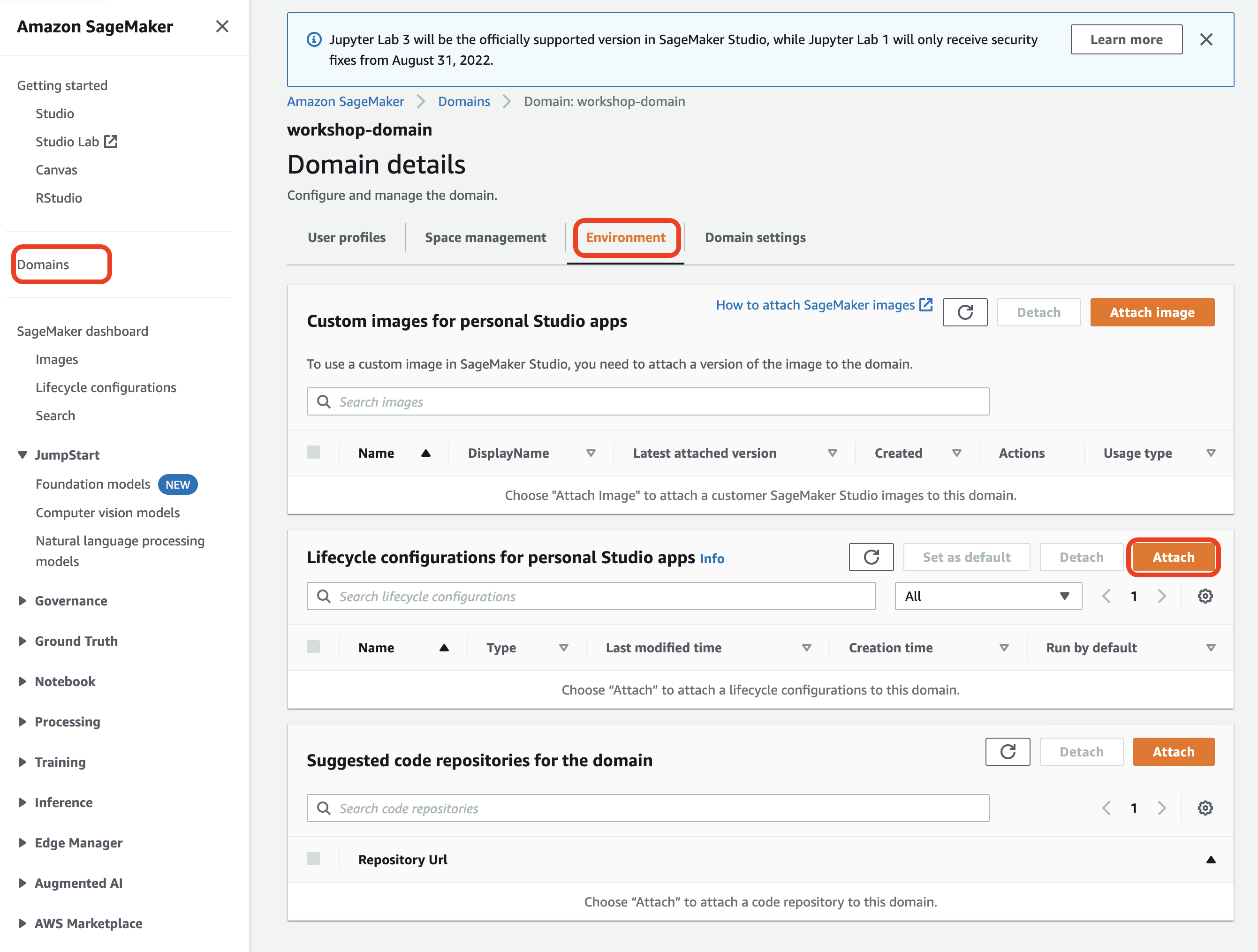 - On the Environment tab, in the Lifecycle configurations for personal Studio apps section, choose Attach.