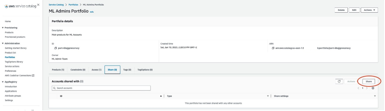 You can share the portfolios with workload accounts in Service Catalog. Again, we use ML Admin Portfolio as an example.