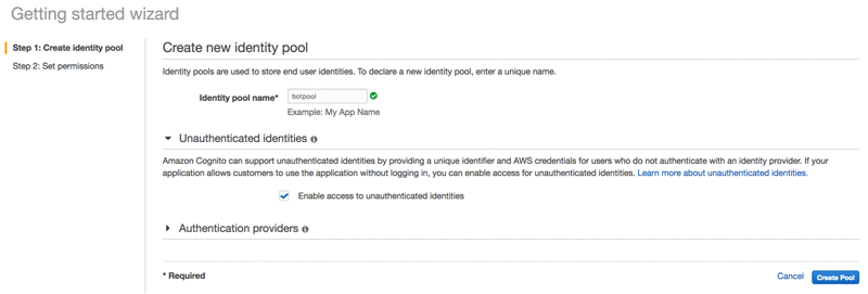 From the Amazon Cognito console, you choose Manage new identity pool, and then choose Create new identity pool. You provide a pool name (botpool), choose Enable access to unauthenticated identities, and then choose Create Pool: