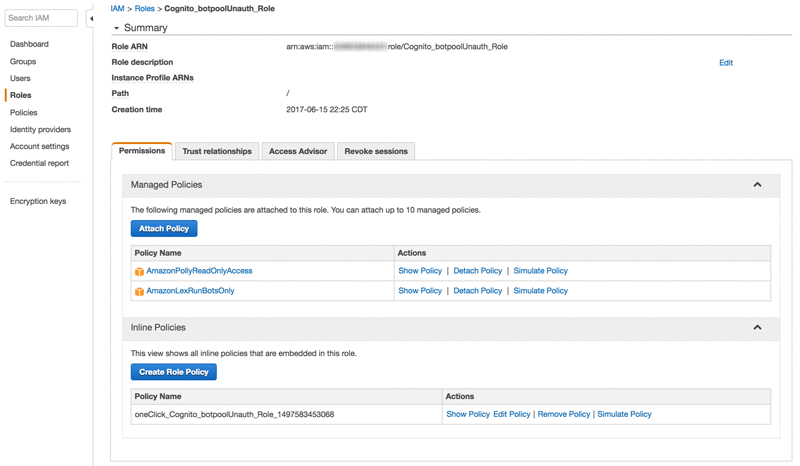 You modify the IAM roles to allow access to Amazon Lex. From the IAM console, you find the roles and change each of them to attach the AmazonLexRunBotsOnly and AmazonPollyReadOnlyAccess policies:
