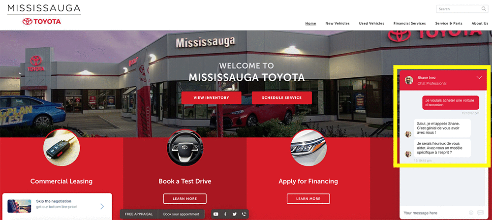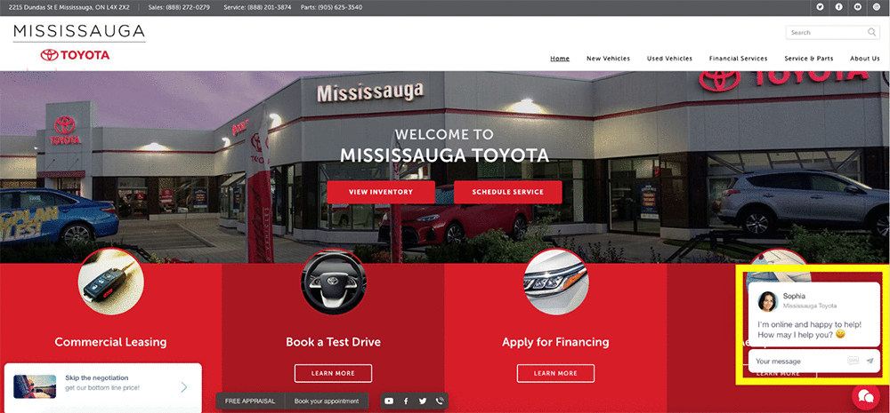 For example, here is how the family-owned-and-operated Mississauga Toyota dealership is using ChatSmart integrated with Amazon Translate. As soon as I enter their online site, I’m greeted by Sophia. See the bottom-right corner of the following screenshot.