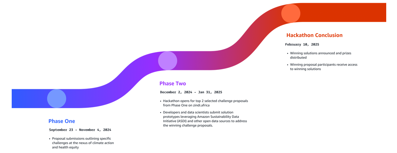 This initiative is made possible through the support of ASDI, which provides researchers, scientists, and innovators with access to a wealth of publicly available datasets on AWS to advance their sustainability-focused work. The AI for Equity Challenge: Climate Action, Gender, and Health is open for submissions from September 23 to November 4, 2024. The two winning proposals from the first round will be announced on December 2, 2024, with the final AI challenge winners revealed on February 12, 2025.
