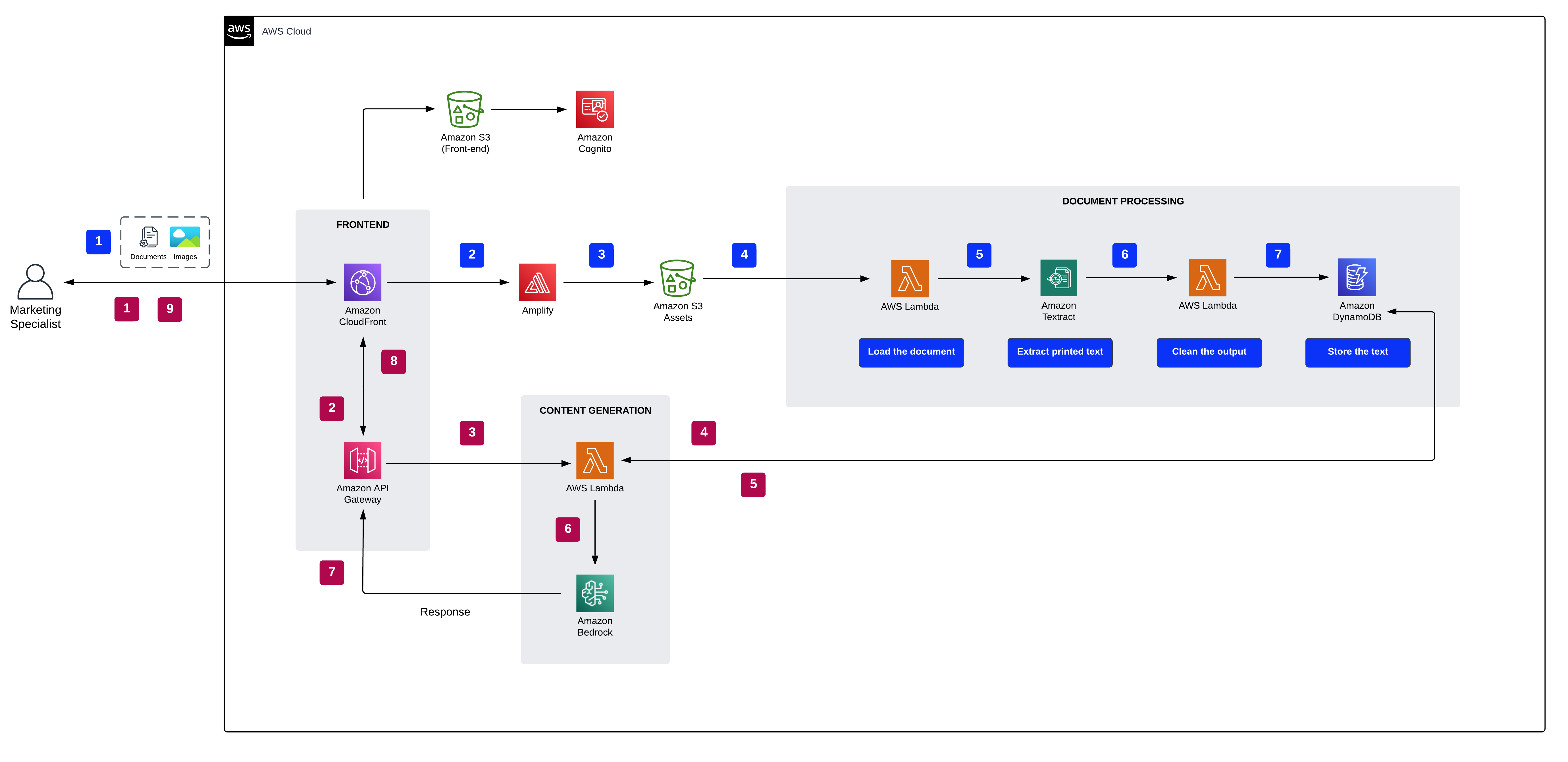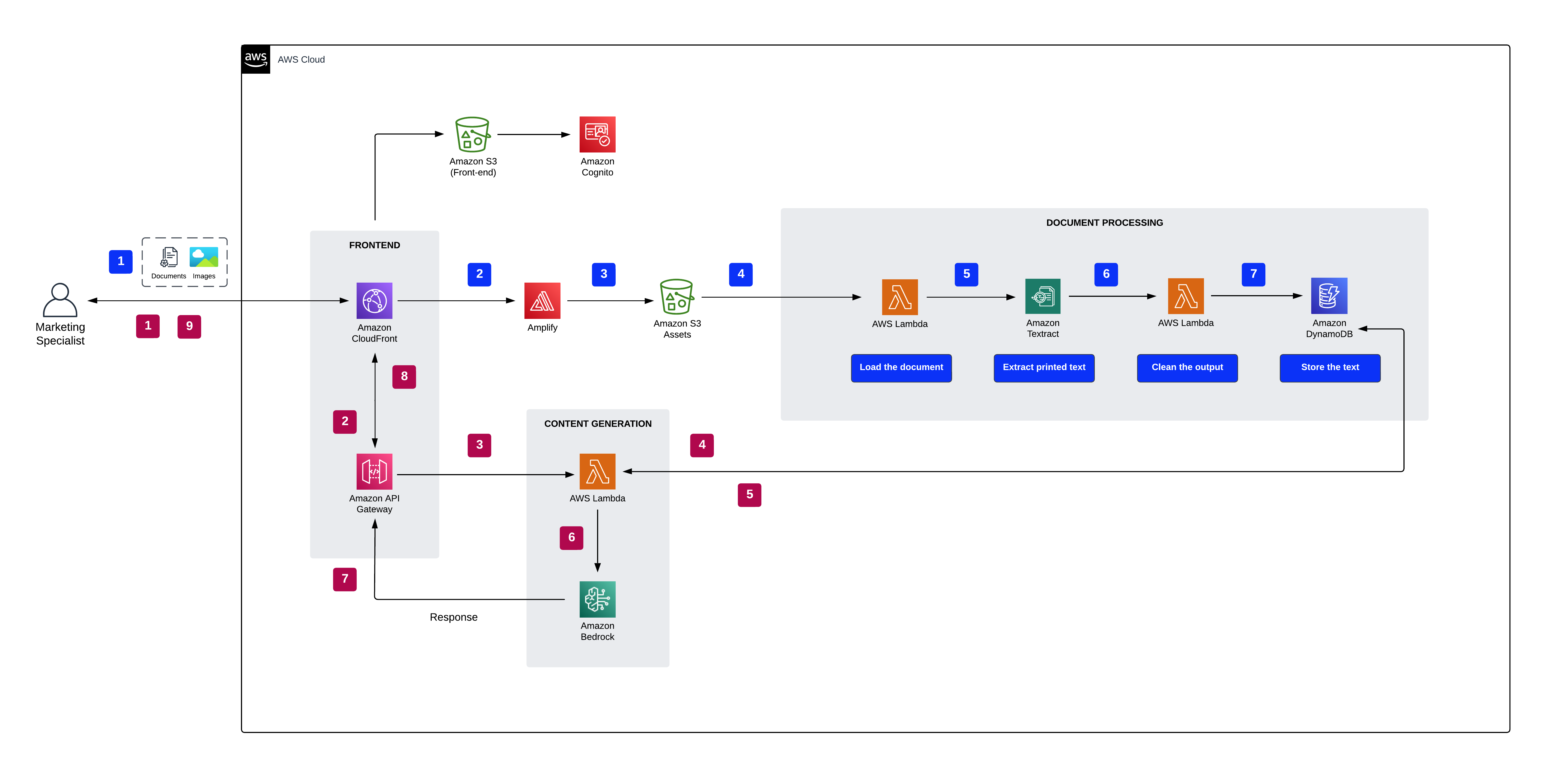 - The user uploads one or more documents to Amazon S3.